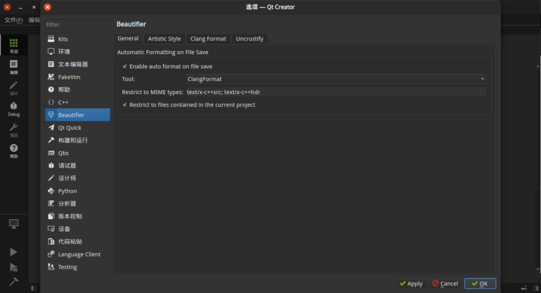 那么如何优雅的实现全面的代码风格格式化?这就需要利用 Qt Creator 内置的 Beautifier 插件。