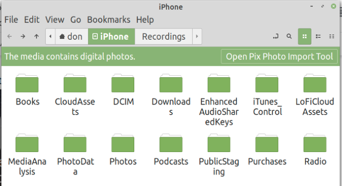 我最常访问的文件夹是DCIM,我的iPhone照片存储在这里。有时我在我写的文章中使用这些照片,有时我想用开源应用程序(如Gimp)来处理这些照片。使用Libimobiledevice实用程序的好处之一是可以直接访问图像,而不是通过电子邮件发送给自己。我可以将这些文件夹复制到我的Linux计算机上。我可以在iPhone上创建文件夹并将其删除。