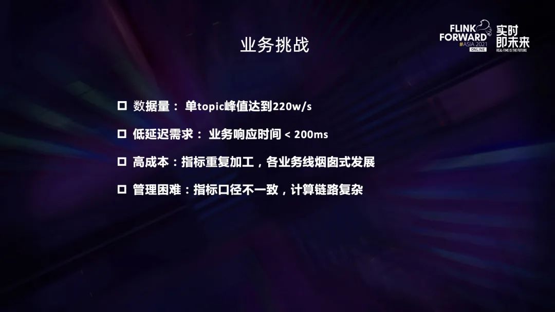 - 另一方面,某些场景下的单 topic 数据量高达 220 万/秒,同时针对风控等场景,业务响应延迟要求 200 毫秒以内。