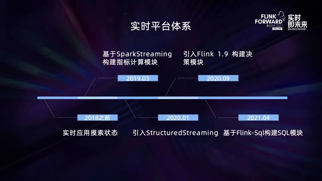 针对以上问题,我们从 18 年开始,结合行业的实践经验,积极探索建立实时加工体系。在 19 年开始着手构建实时指标加工系统,引入 SparkStreaming 作为计算引擎。在 20 年初出于对时效性的考虑,我们引入 StructuredStreaming 作为实时计算引擎。随着服务的应用不断增多,我们接收到依赖原子指标的组合的实时决策需求逐渐增多。因此在 20 年 9 月份,我们开始构建实时决策系统,将 FlinkCEP 引入系统中。直到今年 4 月份,为了解决一些复杂指标的加工需求,我们将 Flink SQL 引入到了指标加工链路中。经过产品的不断迭代,最终形成了一套企业化的智能决策系统——先鉴平台。