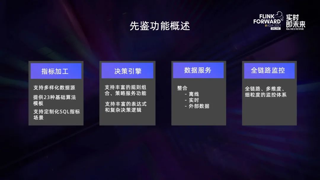 上图展示了先鉴平台的主要功能。首先是实时指标加工。目前我们支持多样化的数据源,主要包含常用的中间件比如 Kafka 及 Pulsar。同时为了降低用户的使用难度,我们提供了 23 种算法模板,也支持 SQL 的定制化加工方式;其次是实时决策。我们支持丰富的规则及规则组的嵌套组合,满足复杂决策的需求。此外,我们整合了实时、离线及第三方的标签,为用户提供统一的数据查询服务,同时为了生产的稳定性,我们提供了全面的监控功能和细粒度资源隔离、熔断、限流的策略。同时针对实时计算作业的运行状态,我们对 Source 及 Sink 的数据量和延迟都进行了相关的 Metrics 监控。