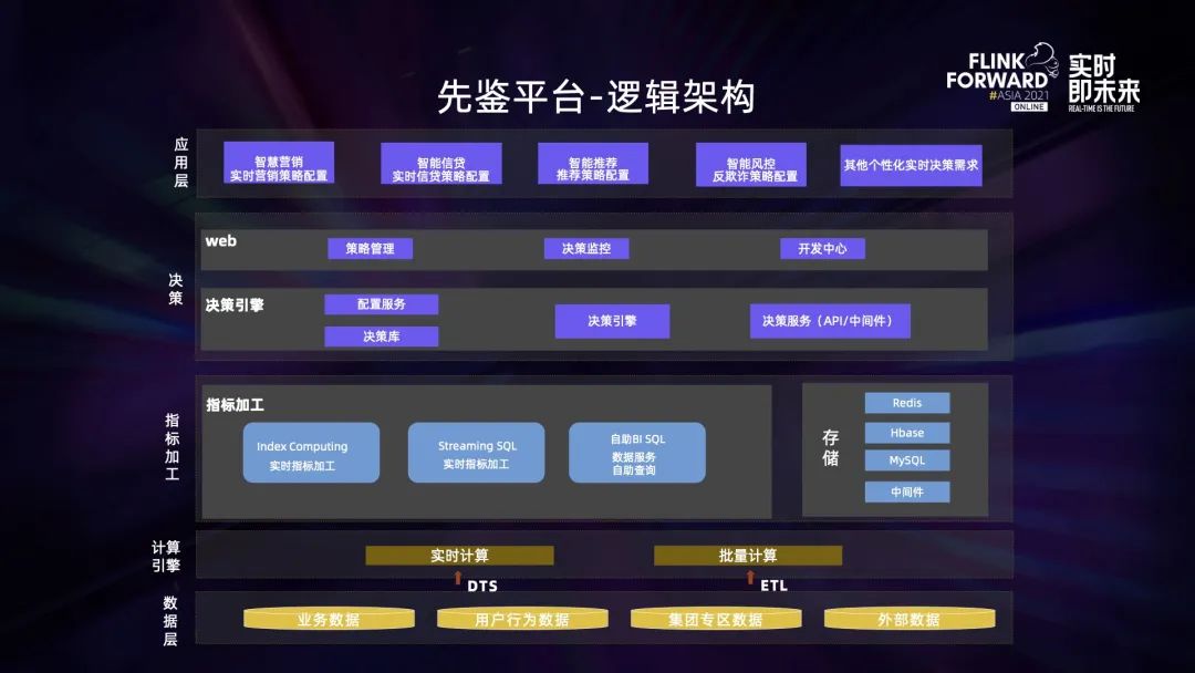 - 最下面是数据层,数据源主要包含业务数据、用户的埋点数据以及集团加工的离线数据。最终根据用户的配置,将计算结果存储到相应的 DB。