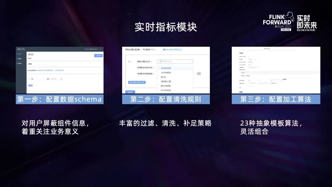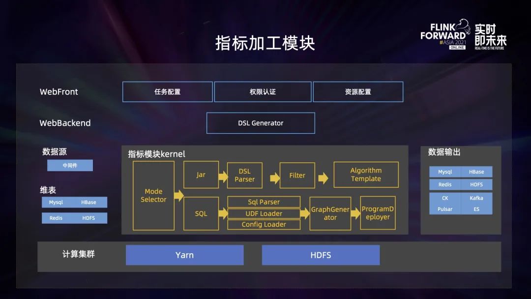 - 第三层是实时指标加工模块,通过用户配置不同的加工方式,录入到不同的执行引擎,同时整合数据服务,为用户提供结果查询;