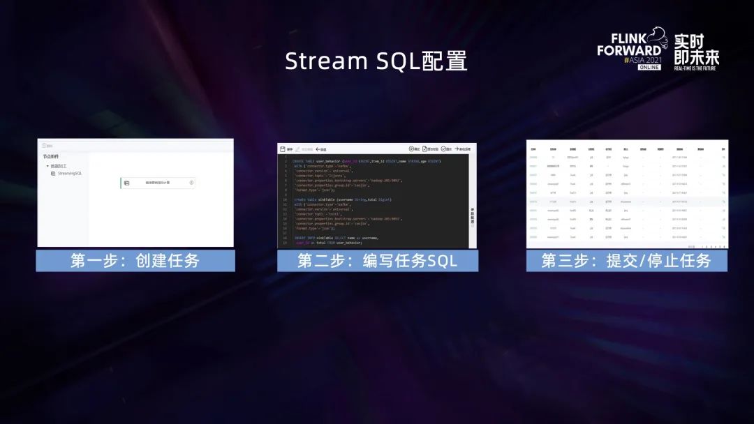 上图展示了 SQL 加工配置的过程。先创建一个任务,包含用户的资源等参数,然后编写任务 SQL,最后上线任务并提交给执行环境。