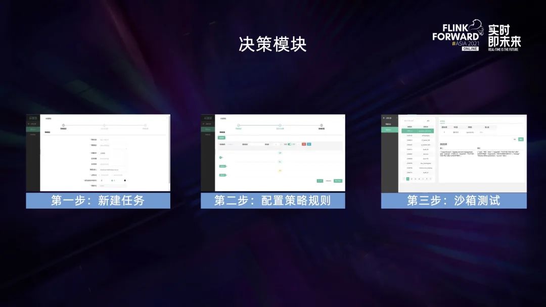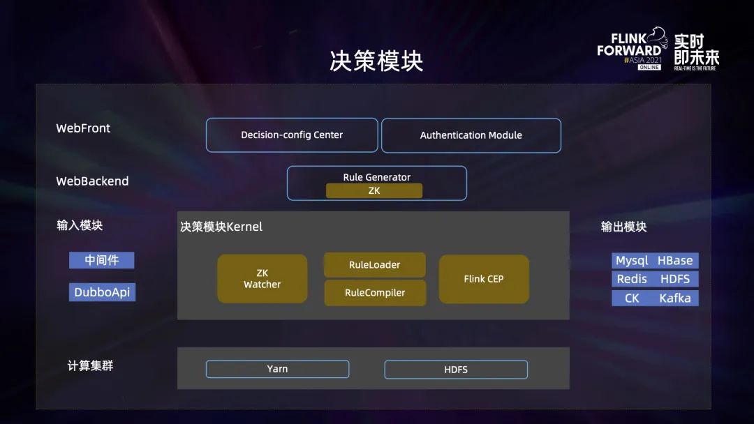 - 往下是实时决策模块,提供实时决策的功能,其中包含 Web 进行决策的配置及管理,同时提供开发中心进行决策任务的验证,通过决策核心进行实时的决策;