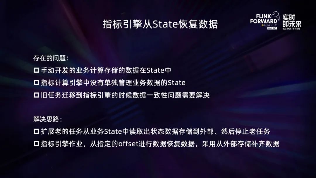 首先是指标作业升级过程中,通过指标引擎配置的 job State 数据一致性问题。早期指标作业是通过手动开发,部分业务 State 存储在 HDFS 中,指标引擎配置的 job 没有单独管理业务 State 的数据,老的任务迁移到平台过程中就会遇到数据一致性问题。解决思路是扩展老的计算程序,读取全量 State 数据存储到外部,然后停止老任务。指标引擎配置的作业从指定的 offset 进行数据计算,然后从外部存储补齐原有的指标数据。