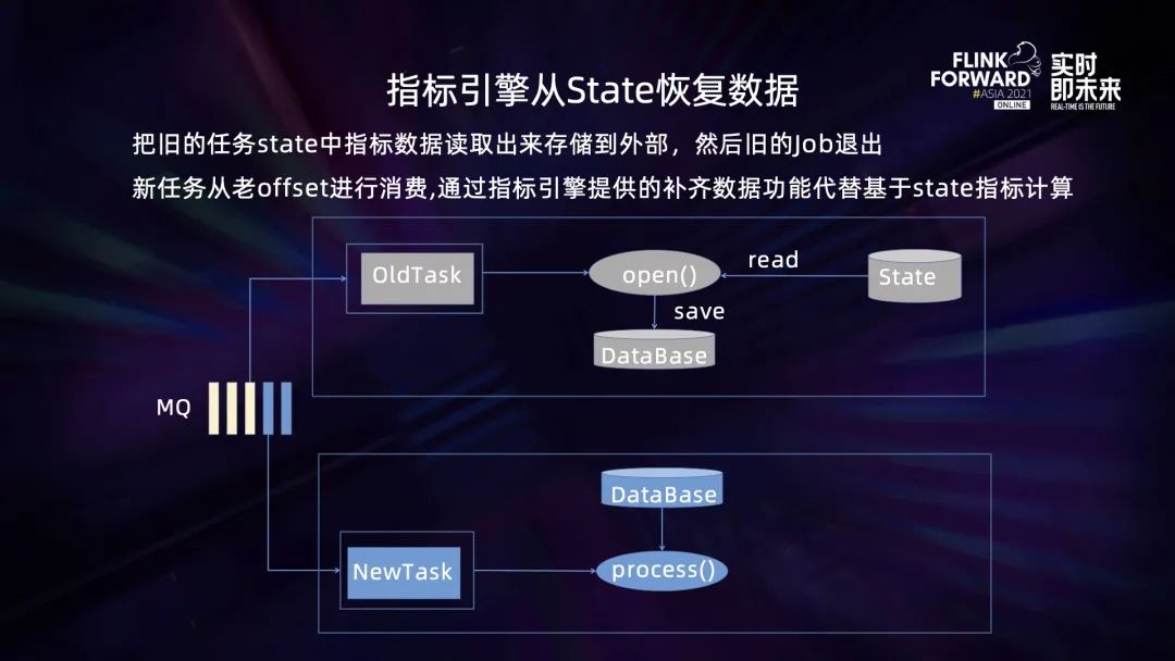 上图展示了作业升级的流程。Task 在 open function 的时候读取业务 State 数据存储到外部。如果是 Keyed State,则 State 接口无法获取当前 task 的所有 State 数据,需要将 State 对象进行向下类型强转,然后获取所有 State 数据指标引擎。作业通过配置指定对应的 offset,通过从外部补齐数据的方式进行指标计算,从而完成数据恢复。