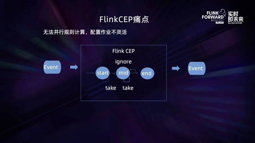 第三,Flink CEP 存在的问题。实时决策的模块是通过 Flink CEP 进行规则匹配,最初是通过程序编码的方式实现规则的匹配,然而随着规则越来越多,不便于维护,开发成本也随之增加。Flink CEP 无法进行动态的规则配置以及多个规则并行决策。针对上述问题,我们对 Flink CEP 进行了扩展开发来解决规则动态配置以及多个规则决策的问题。