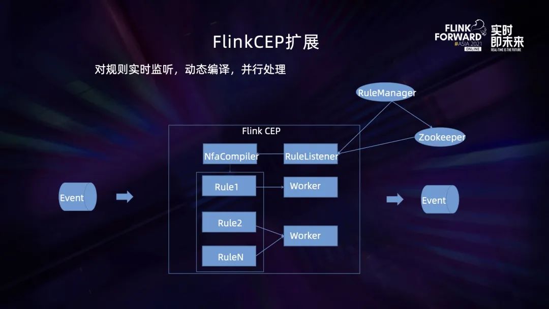上图展示了 Flink CEP 扩展开发的逻辑架构。用户通过 RuleManager 配置规则并将规则变更事件发布到 Zookeeper 中,RuleListener 监听到事件的变更后,若是新增规则,则会通过 groovy 动态语言编译生成 RulePattern 实例。随着规则的增多,CEP operator 线程处理效率会下降,需要通过把规则分组绑定到对应的 Worker 上来加速规则处理。CEP operator 线程接收到事件后会分发给所有 Worker,Worker 线程处理完后通过队列发布到 CEP operator 线程,最后发布到下游。