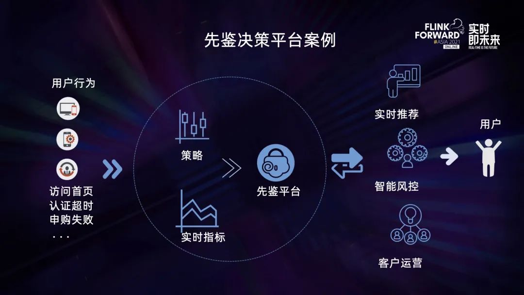 首先,上游的用户行为和业务事件通过数据通道传输到先鉴平台,业务方负责配置实时指标和业务规则,当业务事件通过指标计算结果触发了业务规则,先鉴平台随即将结果推送到下游的消息中心,通过各业务系统触达到用户。比如用户访问理财首页时,如果 30 分钟内未进行产品申购,就会根据用户的资质给他发送对应的推送短信。