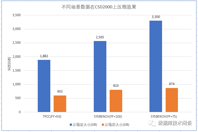 sysbench 场景:100表,每表 1 亿数据,表的填充因子设置为 75 ,数据库文件大小总计为 3300 GB,CSD 内部实际使用空间约 874 GB 。CSD 压缩比为 3.77 。