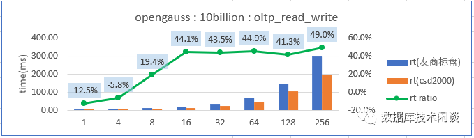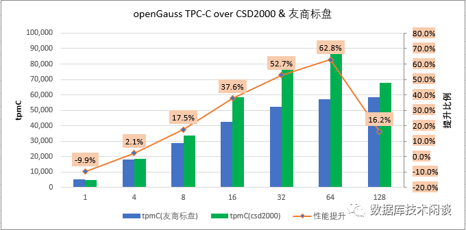 这次没有对比测试 openGauss 数据库的压缩效果。根据其他数据库的测试经验。如果数据库使用 lz4 压缩,在 CSD2000 内部还会有 1.54 的压缩比。有些数据库使用 LSM Tree 模型,数据是分层压缩的,不同层的压缩算法还可以不一样,这些数据在 CSD 内部的压缩效果就取决于数据库里使用用不同压缩算法的数据占比了。