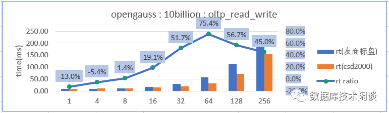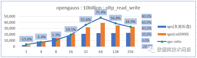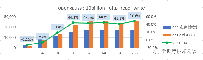 备注:这次性能测试场景数据量造的非常大(1.5T 以上),并且数据库内存不是很大(80G),同时开启了openGauss 的 full_page_writes ,没有刻意对 openGauss 做深入优化。所以数据库压测的时候加在 SSD 上的读写压力很大,整体呈现 IO Bound 特点。 这是为了模拟这种情形,即客户生产业务应用的数据库并不一定总是很优化,在性能出现问题的时候可能存储的读写压力很大,SSD 往往成为性能瓶颈。所以这里测试的结果值跟数据库单纯的做性能测试取得的峰值会有一定差异。我们重点关注相同的数据量相同的数据库软硬件配置在不同的 SSD 上的性能差异。