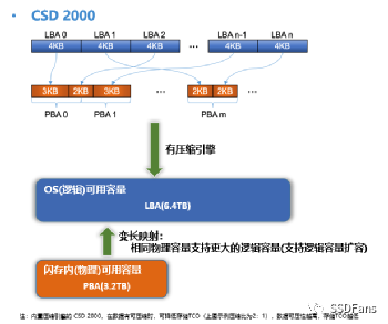 压缩比浮动可能会让人担心。为了放心,运维可以监控 SSD 的可用物理空间。正如 ORACLE 数据库管理员要监控磁盘可用空间,也要监控数据库内部表空间的可用空间,使用 CSD 2000 还要监控 SSD 内部可用物理空间。CSD 2000 的透明压缩没有修改文件系统的接口,所以用户在看数据文件大小看到的都是压缩前的大小,也叫逻辑空间大小(其访问地址对应为 LBA,Logical Block Address)。这点是CSD透明压缩区别于文件系统(如zfs)压缩方案。在 SSD 内部还有个物理空间地址 PBA (Physical Block Address)。