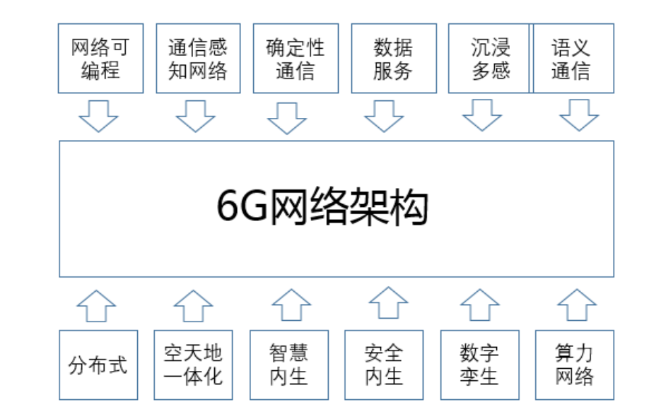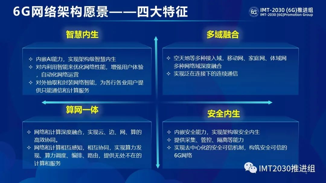 在6G网络架构愿景中,主要聚焦了智慧内生、安全内生、多域融合、算网一体等四大特征: