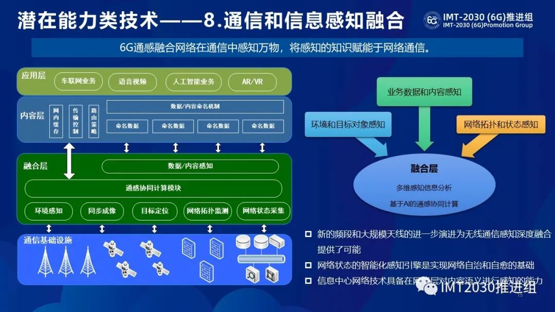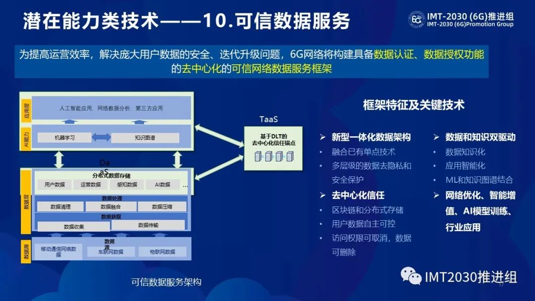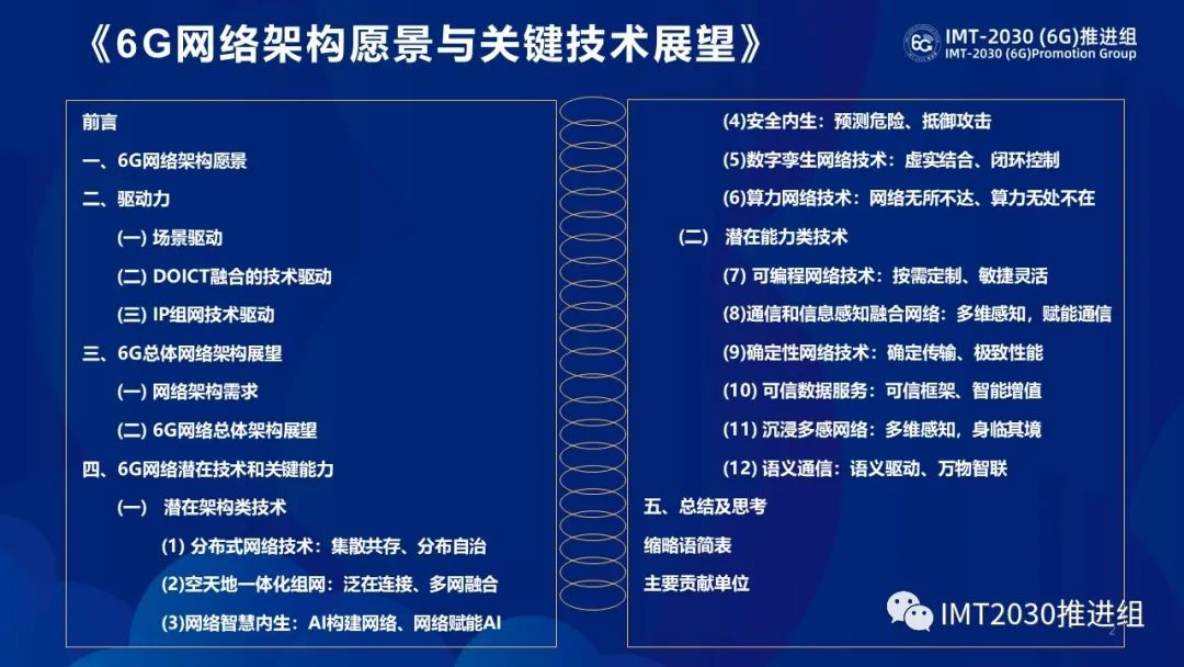 对未来6G网络的总结及展望方面,白皮书指出,面向6G的移动通信系统架构和关键技术还处于探索阶段,一些技术发展方向正逐渐形成共识,分布式、天地一体化、智慧内生、安全内生等潜在架构类技术及网络可编程、数据服务等关键能力类技术,将有机融合,共同实现6G网络整体架构。