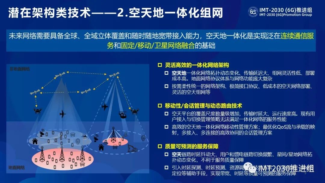 3)多域融合:空天地等多种接入域,移动网、家庭网、体域网多种网络域深度融合,实现泛在连接下的连续通信。高/中/低轨卫星网络、空基平台网络与地面网络深度融合,实现人联与物联、无线与有线、广域和近域、空天和地面等的智能全连接,采用空天地一体化协议体系,实现不同地域、不同用途、不同行业网络的跨界融合,构筑泛在连接的网络基座,为用户提供全时全域无缝覆盖的高可靠通信服务。移动网、家庭网、体域网等多种网络域共同形成完整的6G网络,多个网络域之间打破原有的固定边界,形成连接与融合,通过多网络域下的终端识别、服务连续性保障、终端信息共享、端到端服务质量保障等,为用户提供无感知的网络接入、数据传输及切换体验。