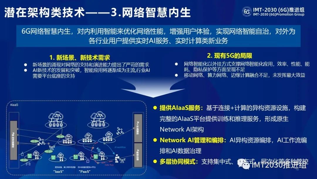 1)智慧内生:6G网络内嵌AI能力,实现架构级智慧内生。对内能够利用智能来优化网络性能,增强用户体验,自动化网络运营,即AI构建网络;对外能够抽取和封装网络智能,为各行各业用户提供网络和AI结合的通信和计算服务,即网络赋能AI。通过内嵌AI能力,实现DOICT融合的智能感知、智能连接、智能发现、智能服务、智能管理和智能编排,奠定万物智联的基础。