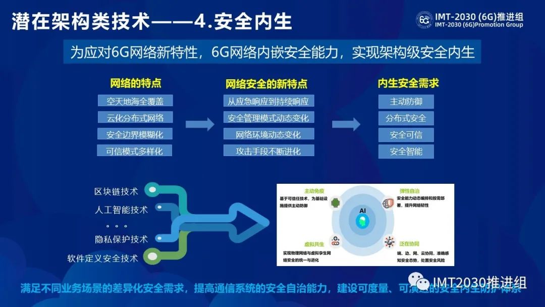 2)安全内生:6G网络内嵌安全能力,实现架构级安全内生。通过6G网络内置基础安全能力,提供采集、管控、隔离等能力。基于分布式技术,实现去中心化的安全可信机制,构筑安全可信的6G网络,满足不同业务场景的差异化安全需求,提高通信系统的安全自治能力,建设可度量、可演进的安全内生防护体系。