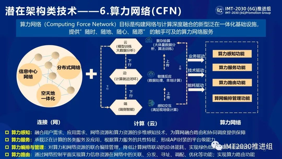 4)算网一体:网络和计算深度融合,实现云、边、网、算的高效协同。网络和计算相互感知,相互协同,实现实时准确的算力发现、灵活动态的计算和连接服务的调度,提供无处不在的计算和服务,实现算力资源的合理分配和用户无感知,赋能一致化用户体验,提高网络资源、计算资源利用效率。