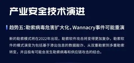 《2022产业互联网安全十大趋势》已发布,其中明确指出,2022年勒索病毒威胁依然存在。