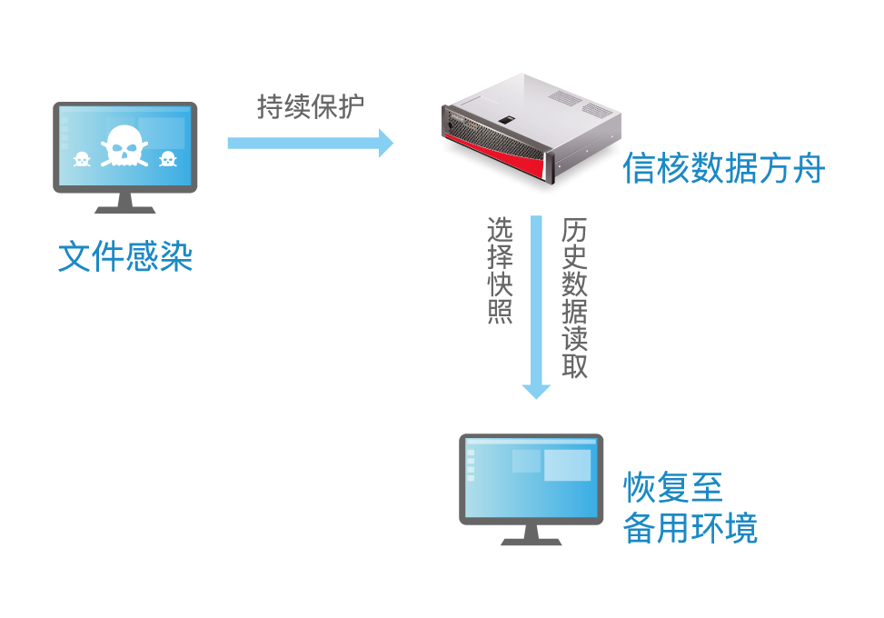 文件、数据库被病毒锁死,可直接通过信核灾备一体机(数据方舟)的极速挂载功能,将健康数据挂载至备用环境,进行历史数据提取。