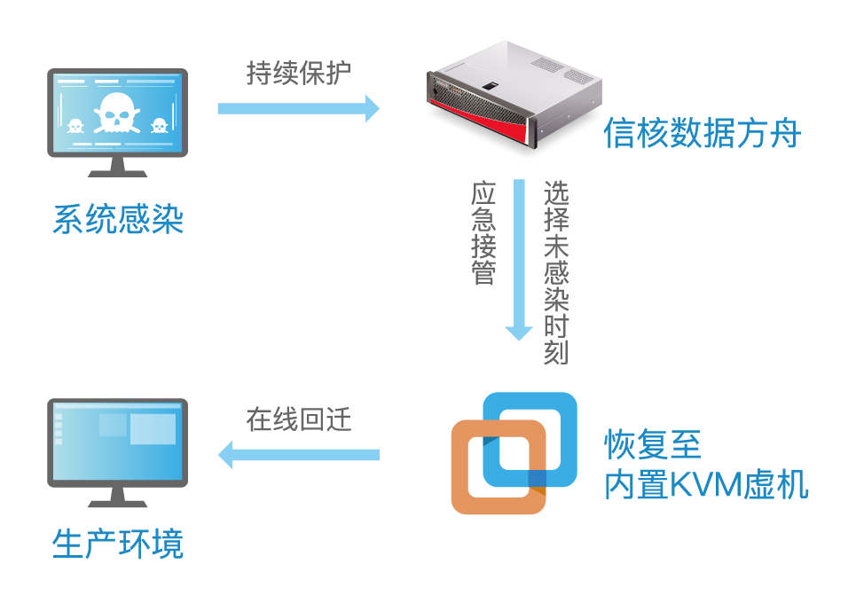 用户系统被勒索病毒锁死,可通过信核灾备一体机的应急接管功能快速将业务恢复至被锁前状态,在原有业务环境修复或新业务环境搭建完成后,通过在线回迁功能,快速将业务交割至生产环境。