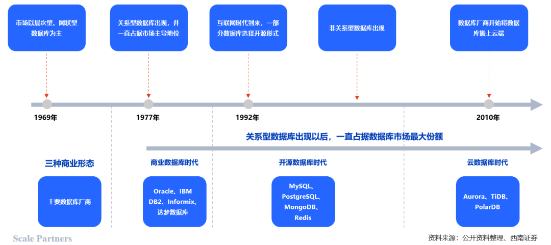 数据库发展经历萌芽-商业化起步-发展成熟阶段。