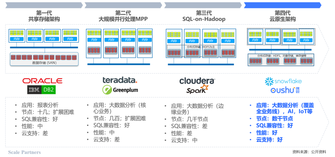 以AP为例,OLAP从最早的数据库一体机,逐渐演变到MPP数据库和Hadoop数据库,再到云原生架构的数据库,数据库一体机价格非常昂贵,国产替代有南大通用、人大金仓、天玑、云和恩墨等;而MPP数据库的实时性非常强,现在主要是Greenplum、Teradata;最后是Hadoop,有星环、中兴、华为等传统的硬件厂商在搭建Hadoop数据仓库;最新一代为云原生,检具扩展、存算分离、弹性扩容等特点。