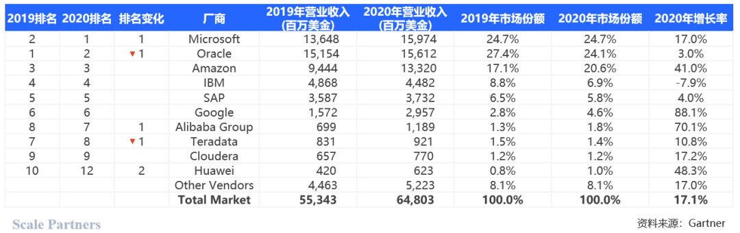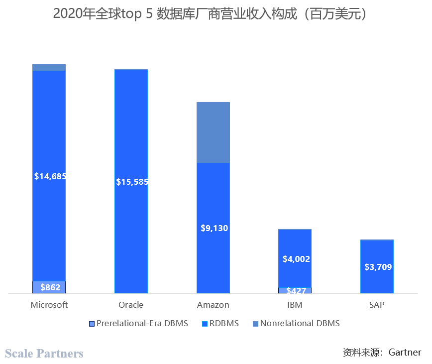 Gartner对数据库细分市场的规模统计,2020年关系型数据库全球市场规模为531亿美元,占比83.3%。