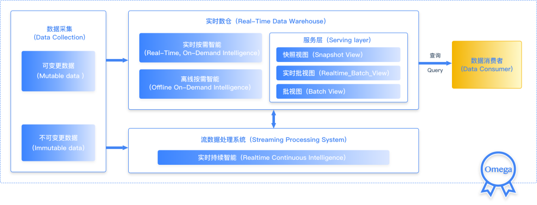 Omega实时方案:率先提出Omega架构,由流数据处理系统和实时数仓构成。相比Lambda和Kappa,Omega架构在批处理层同时满足实时按需和离线按需的数据处理,同时在服务层创新引入了快照视图 (Snapshot View),解决了Lambda 长期的数据一致性问题;