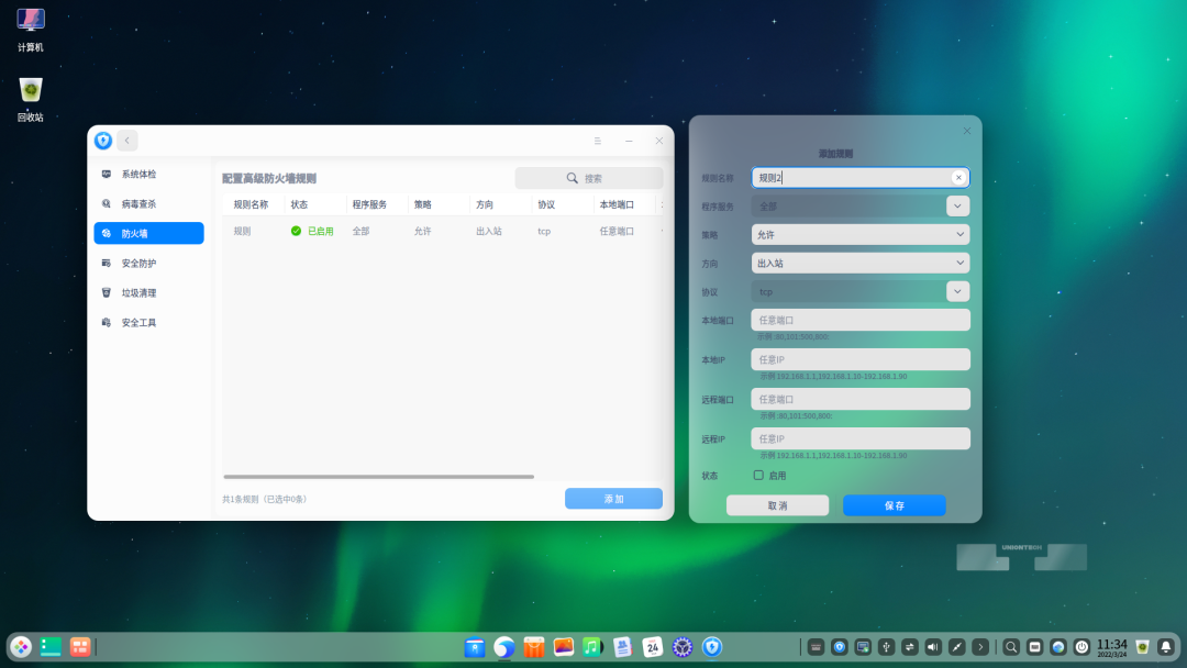 用户可在【安全中心-> 防火墙配置】中根据终端所处于的网络环境和实际的安全需求灵活配置防火墙规则,如程序服务、策略、方向、协议、端口等参数。还可对防火墙规则进行新增、删除、启用 停用、修改。