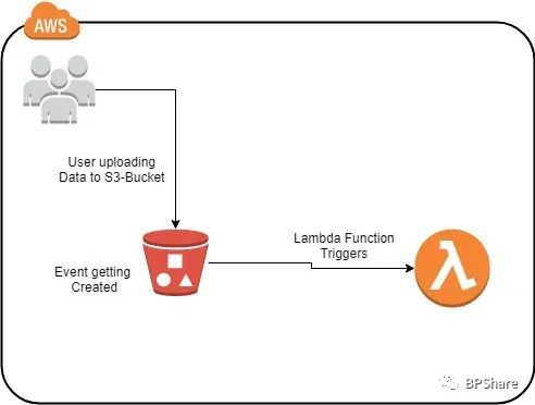 那如何让AWS S3这个服务去触发AWS Lambda服务呢?想必你已经想到了,上一个专题我们提到过一个关键词:事件。这个是最重要的一个概念,很多互联网技术都会有event这个概念。当我们在AWS S3上开启了event功能,就可以和AWS Lambda做关联,去触发lambda function了。大概的流程是这么个样子: