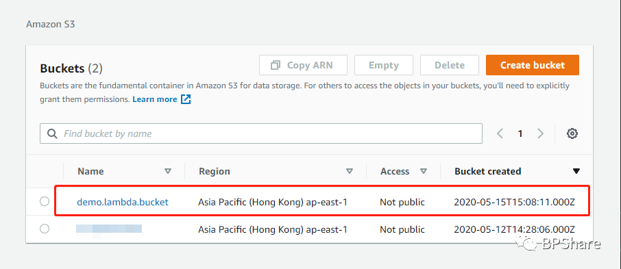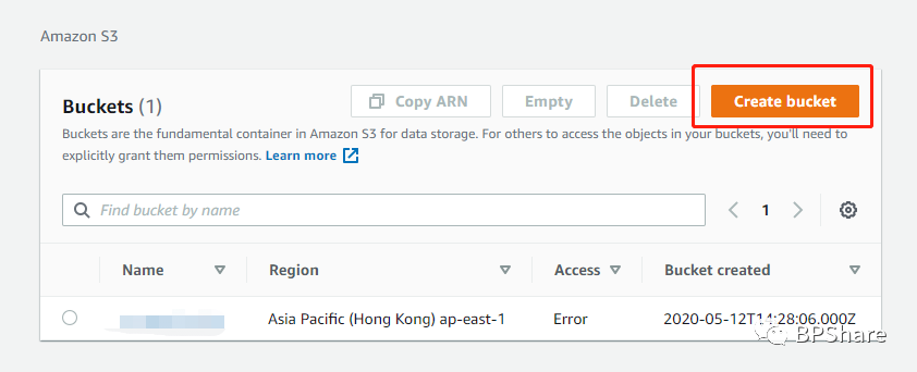 页面将会直接跳转到S3服务页面,这里说明一下Bucket,网上一般翻译成存储桶,还是比较贴切这个服务的,Bucket也是S3服务的一个最基本也是最重要的一个概念。记住bucket就是存放你数据的地方就行了,你也可以把一个bucket就是Windows下的一个磁盘。那我们现在就来创建一个bucket。