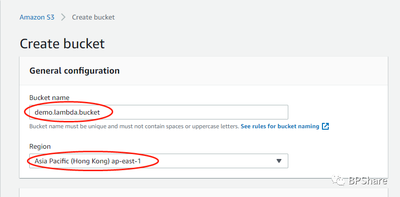 - Bucket name: 必须要提供的,而且是要唯一的,不能有空格或者大写字母。