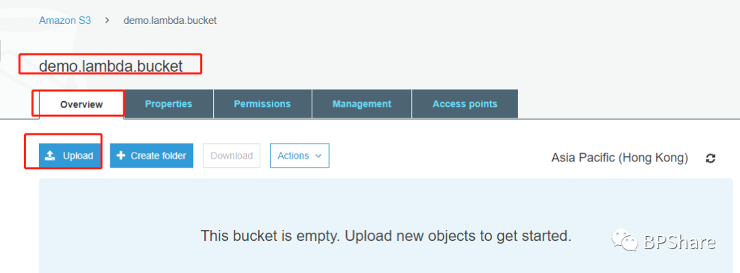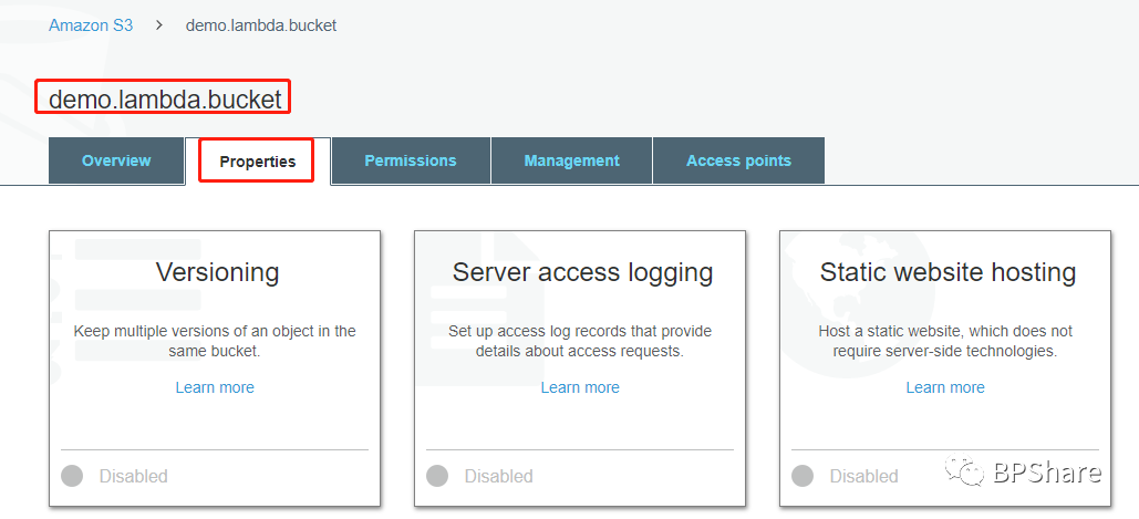 然后点击我们新创建的bucket的名称:demo.lambda.bucket,我们会进入到这个bucket里面。接着点击"Properties"这个tab。