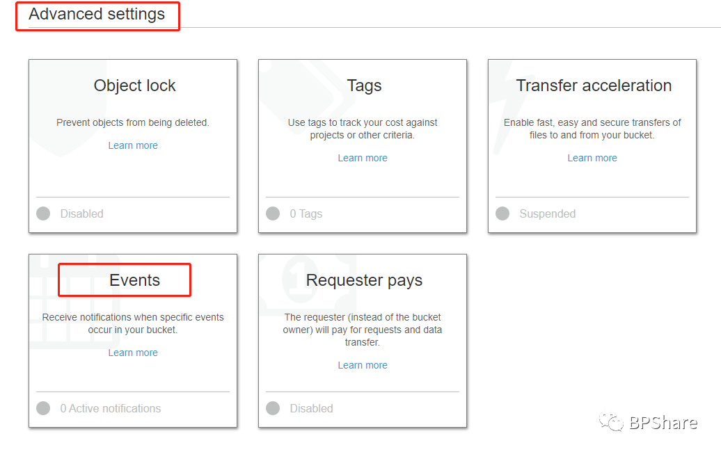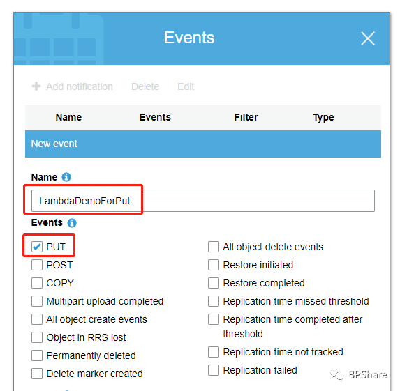 - Events type:我们来选择PUT,因为我们这次只是测试文件上传操作。