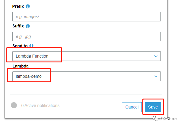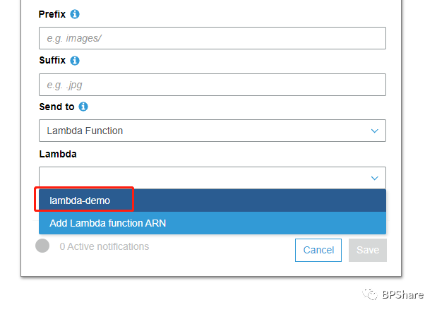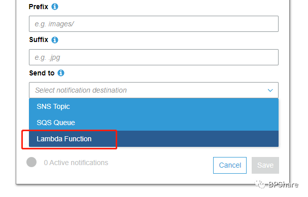 - Send to,我们要指定你这个notification是要发给哪个服务,这里我们选择Lambda Function。