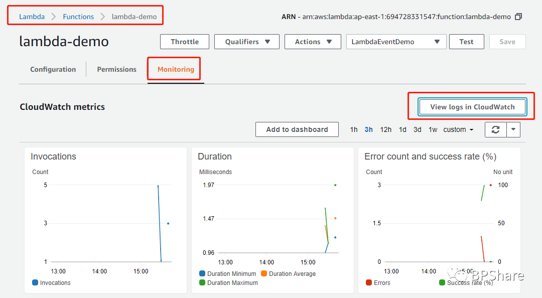文件上传成功后,我们打开我们创建的那个Lambda function,切换到Monitoring这个tab,这个是可视化的图表呈现,我们要去另外一个地方:View log in CloudWatch