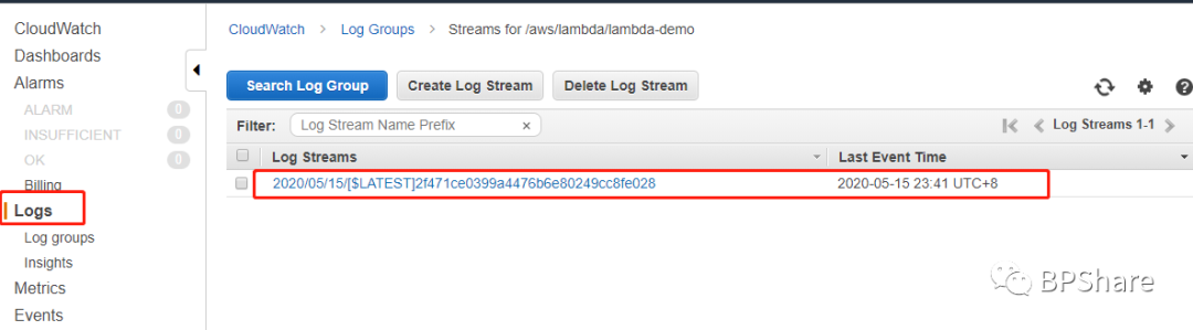 点击View log in CloudWatch之后,我们就到了Log检查页面,就会发现已经有了一条log,我们点击一下。
