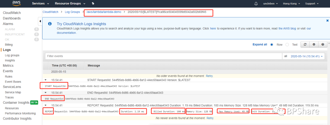 在log详情页面,展开下面3条数据,我们可以看到下面的信息,目前觉得只有最后一条还可以看看,关于这个lambda的执行时间,收费时间,设置的内存大小,执行这个lambda function时使用的最大内存,初始化时间。