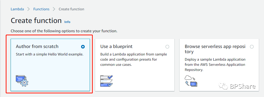 在Create function第一个选项,保持默认"Author from scratch"选项。