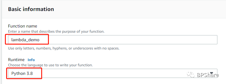 接下来在Basic information部分,你需要在Function name文本框里给你的function起一个名字,养成见名知意的好习惯。