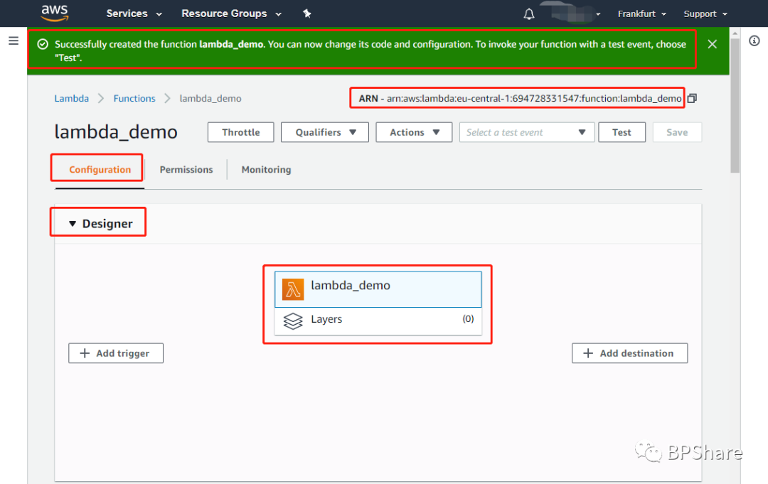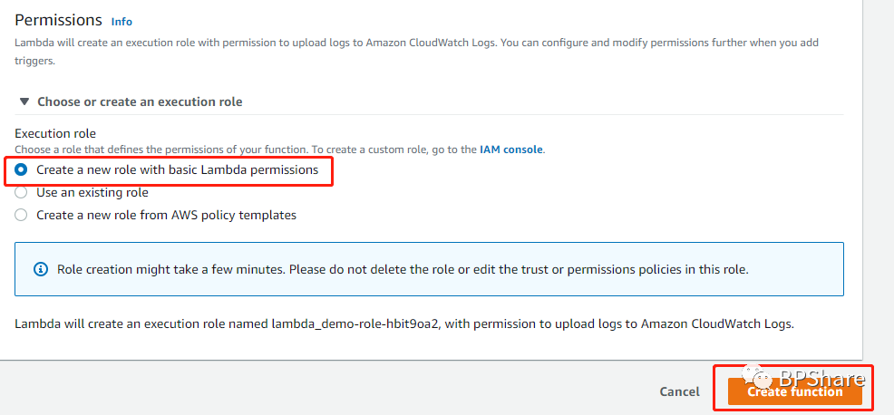 Permissions这里先暂时保持默认,因为我们这一节只是写一个最简单的AWS Lambda的function:用Python打印一句Hello, AWS Lambda! 最后点击Create function按钮。