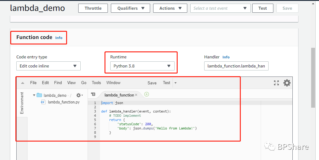 往下翻页面,你会看到Function code区域,写过代码的同学,是不是很熟悉?其实就是一个在线的代码编辑器,Runtime选项那里支持多种语言,由于我们创建function的时候,已经指定了Python,所以Runtime那里是Python 3.8,代码区域默认生成的也是Python代码。