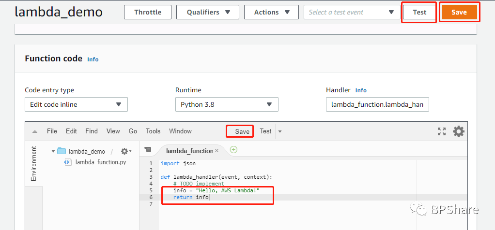 我们现在将代码改成下面的样子,只输出一句话:Hello, AWS Lambda! 然后点击 Save 按钮。