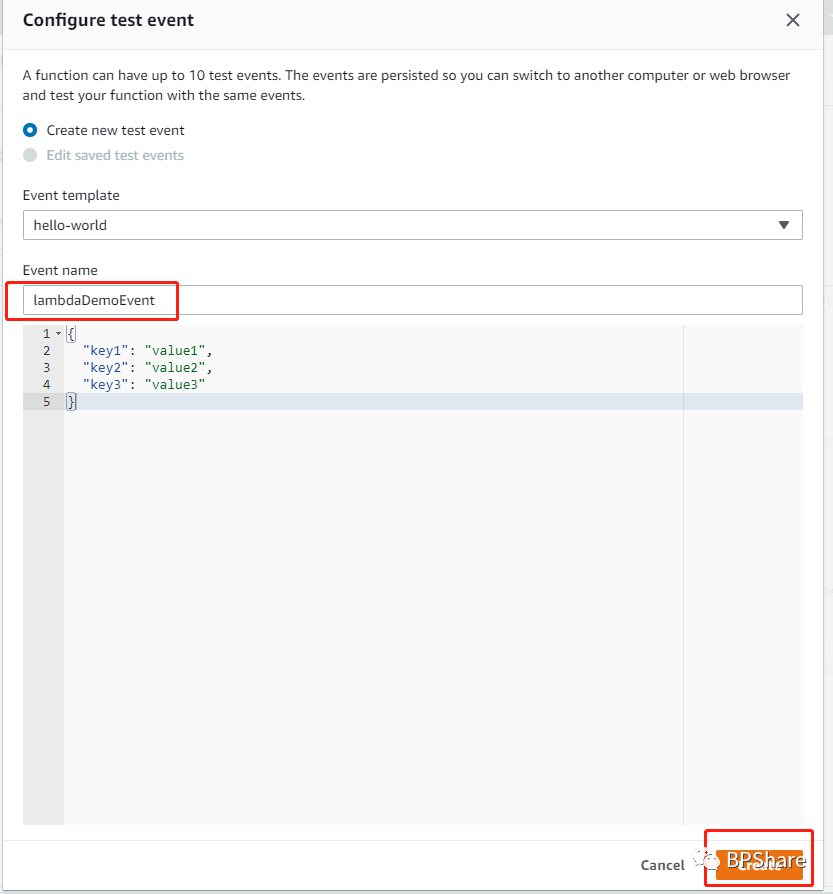 点击Save按钮之后,Configure test event页面会跳出来,你只需要填写一下Event name就可以,名字还是要见名知意,下面的字典内容不用管。