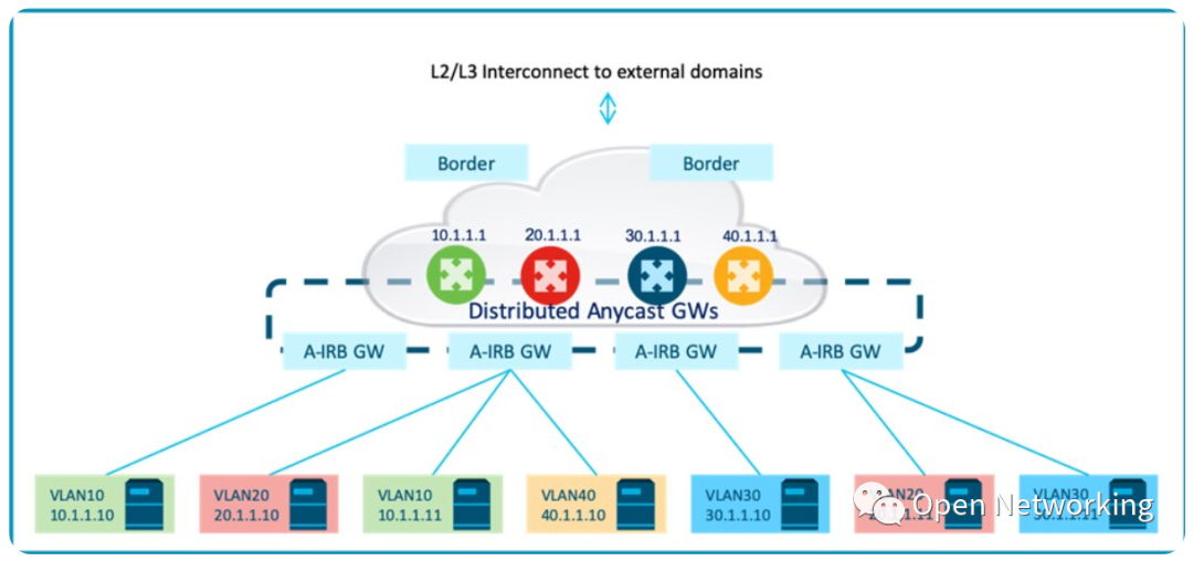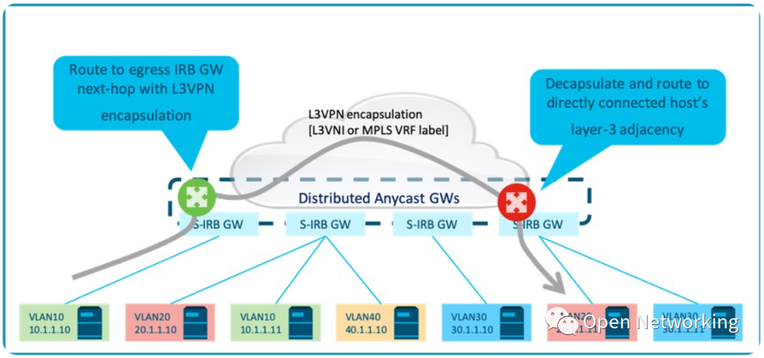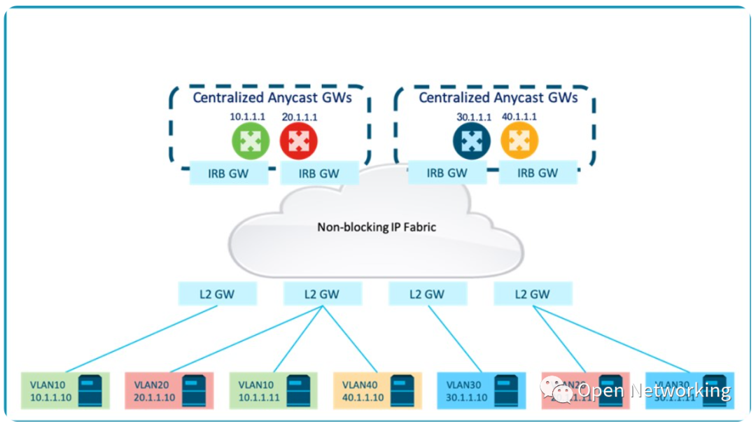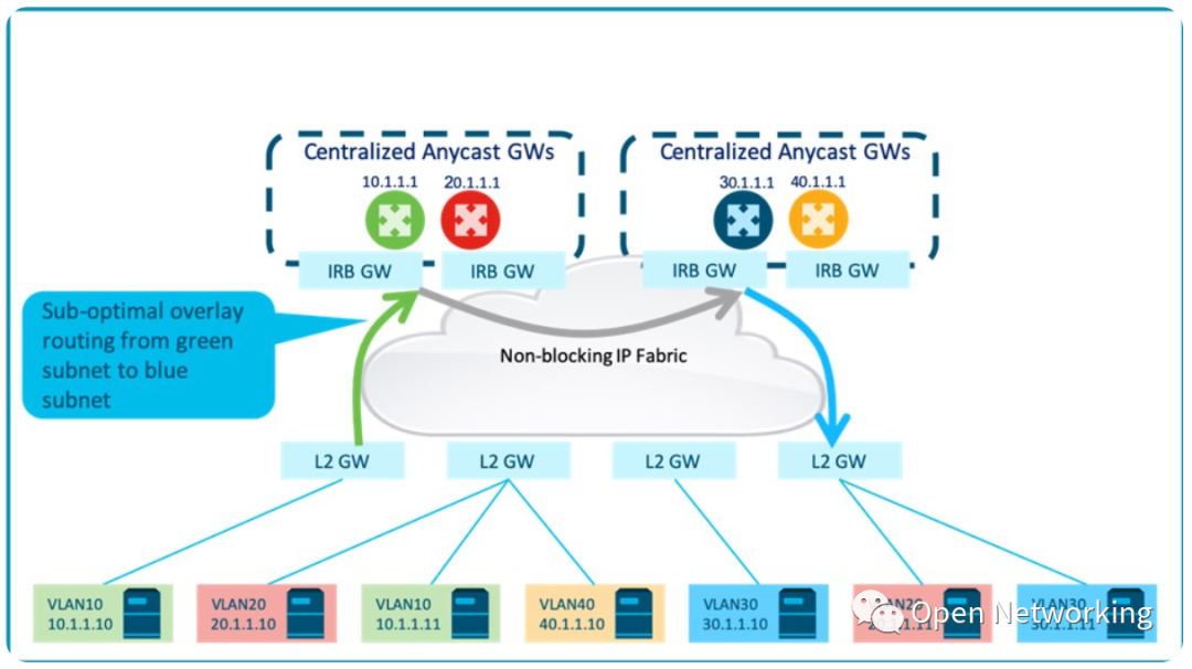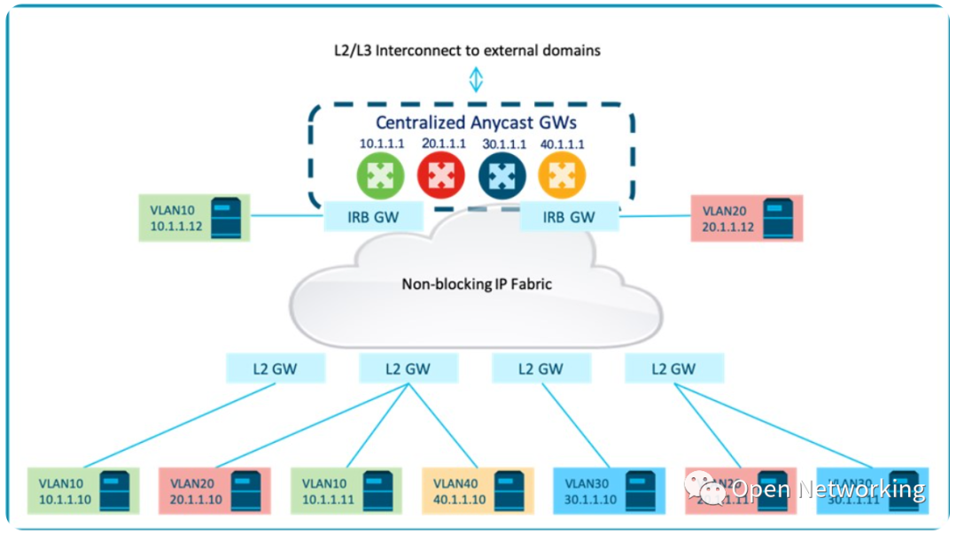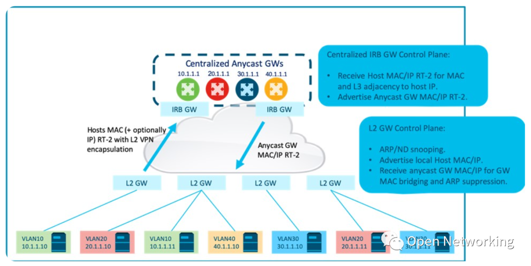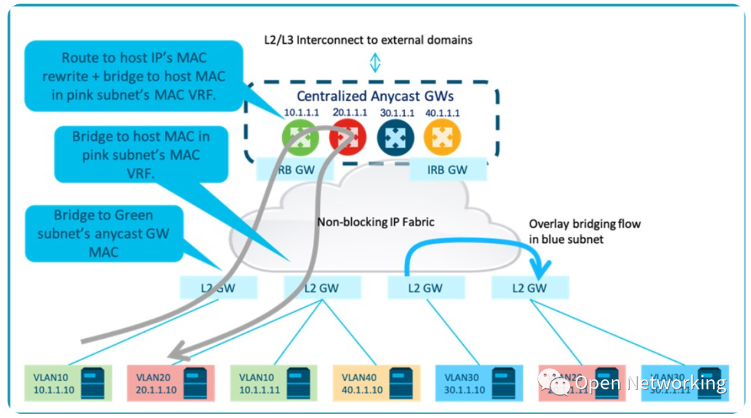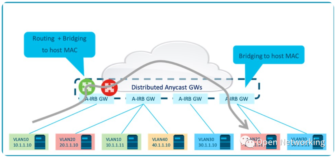或者,不同子网的第一跳路由服务可以在多个集中的任播网关集群之间进行负载,以减少每个IRB节点的规模。