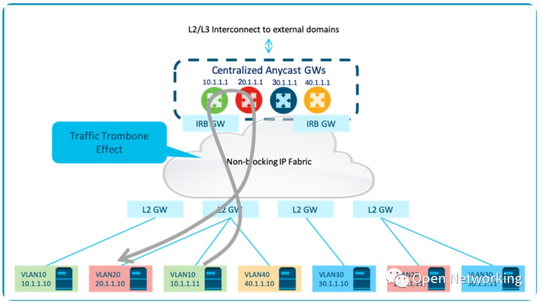 跨冗余IRB网关的集中式任播网关方法引入了额外复杂性: