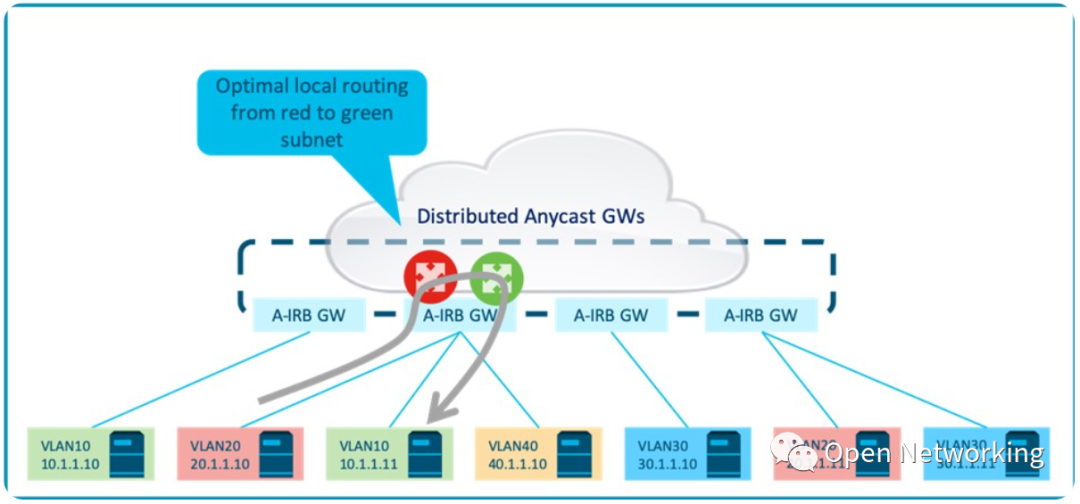 与非对称IRB一样,本地子网间流量总是在入口上本地路由,而跨子网间总是直接路由到出口。